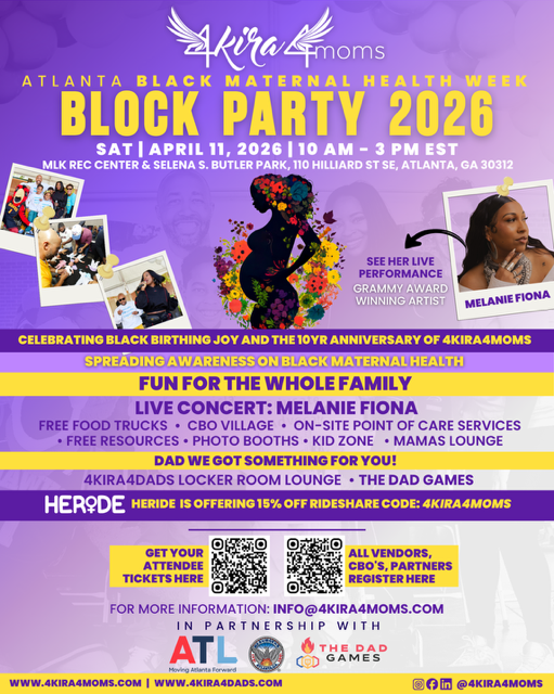 ATLANTA, GA, UNITED STATES, April 9, 2026 /EINPresswire.com/ — 4Kira4Moms proudly announces the activities and guests for the 4th Annual Black Maternal Health Week Block Party, taking place on Saturday, April 11, 2026, from 10:00 a.m. to 3:30 p.m., in partnership with the City of Atlanta, Mayor Andre Dickens’ Office, and the Office of Constituent Services.